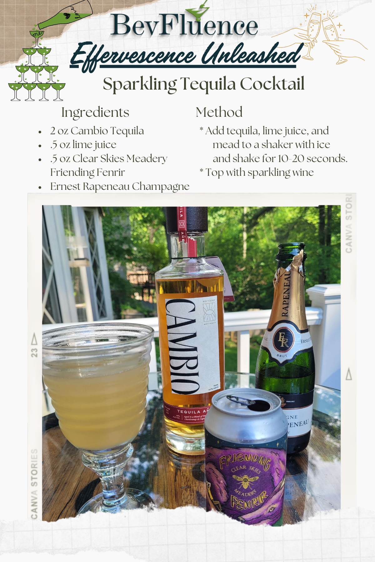 The Effervescence Unleashed Cocktail of the Month for May 2025 is the Sparkling Tequila. Simply add tequila, lime juice, and mead (or simple syrup) to a shaker. Shake for 10-20 seconds and top with sparkling wine.Ingredients